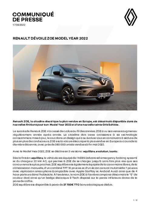 Le succès de Renault ZOE n'a cessé de croître au fil des années. ZOE a vu ses ventes augmenter régulièrement année après année. La citadine doit cette croissance à sa technologie constamment mise à jour, le tout dans un design qui a su évoluer tout en continuant à séduire de plus en plus de conducteurs. ZOE est la voiture électrique la plus vendue en Europe au cours de la dernière décennie, avec près de 380 000 unités vendues à fin mai 2022.