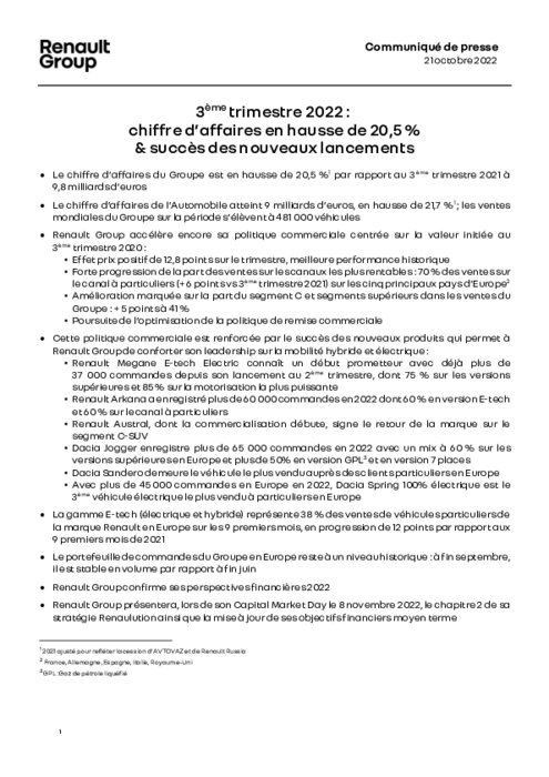 La marque Renault a ainsi vu ses ventes baisser de 4,8% en volume par rapport à 2021 (hors ventes en Russie), à 321.000 unités, mais Dacia a vu les siennes progresser de 4,5% à 145.000 exemplaires. Le total au niveau du groupe est de 481.000 véhicules (-2,4%), contre près de 600.000 au troisième trimestre 2021 avec les ventes russes.