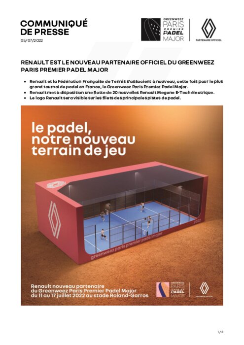 Après le grand succès de la collaboration lors du dernier tournoi de Roland-Garros, Renault a décidé de s'associer à la Fédération Française de Tennis sur un autre sport de raquette : le padel. Une discipline jeune, ludique, tendance et en plein essor, qui prend de l'ampleur en comptant sur toujours plus de joueurs, de fans et de tournois internationaux tout autour du globe.