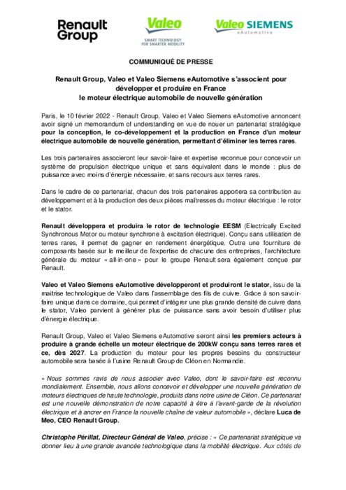 Le groupe Renault, Valeo et sa coentreprise Valeo Siemens eAutomotive ont annoncé jeudi avoir signé un accord pour concevoir, développer et produire en France un moteur électrique de nouvelle génération "permettant d'éliminer les terres rares".