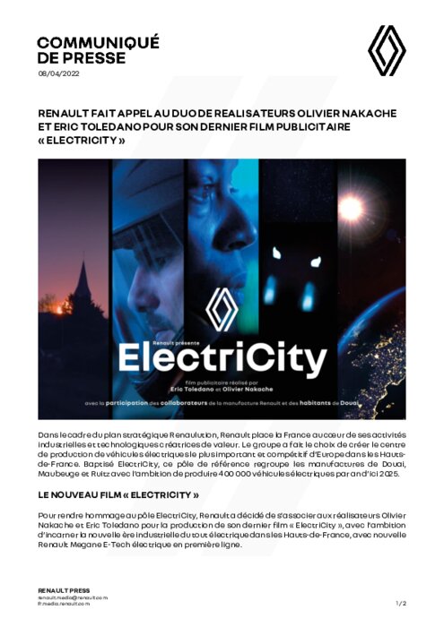 Dans le cadre du plan stratégique Renaulution, Renault place la France au cœur de ses activités industrielles et technologiques créatrices de valeur. Le groupe a fait le choix de créer le centre de production de véhicules électriques le plus important et compétitif d’Europe dans les Hauts-de-France. Baptisé ElectriCity, ce pôle de référence regroupe les manufactures de Douai, Maubeuge et Ruitz avec l’ambition de produire 400 000 véhicules électriques par an d’ici 2025.