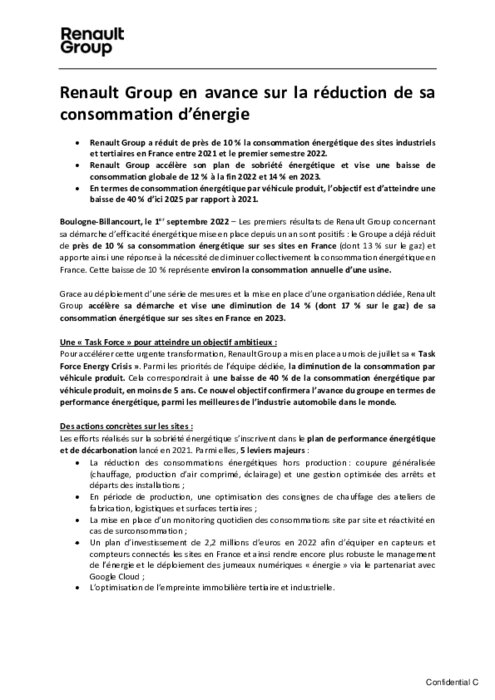 Les premiers résultats de Renault Group concernant sa démarche d’efficacité énergétique mise en place depuis un an sont positifs : le Groupe a déjà réduit de près de 10 % sa consommation énergétique sur ses sites en France (dont 13 % sur le gaz) et apporte ainsi une réponse à la nécessité de diminuer collectivement la consommation énergétique en France. Cette baisse de 10 % représente environ la consommation annuelle d’une usine.