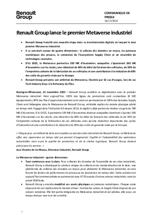 Renault Group accélère sa digitalisation avec le premier Metaverse industriel. Ainsi aujourd’hui, 100% des lignes de production sont connectées (8 500 équipements), 90% des flux d’approvisionnement sont suivis en permanence et 100% des données Supply Chain sont hébergées dans le Metaverse de Renault Group, véritable replica du monde physique piloté en temps réel. Engagé dans l’Industrie 4.0 depuis 2016, le digital a déjà permis de réaliser un gain de 780 M€ d’économie.