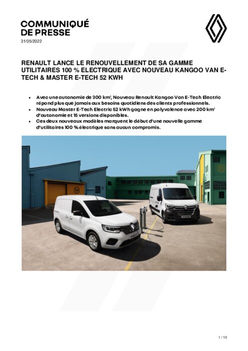 Avec une autonomie de 300 km1, Nouveau Renault Kangoo Van E-Tech Electric répond plus que jamais aux besoins quotidiens des clients professionnels. Nouveau Master E-Tech Electric 52 kWh gagne en polyvalence avec 200 km1 d’autonomie et 15 versions disponibles. Ces deux nouveaux modèles marquent le début d’une nouvelle gamme d’utilitaires 100 % électrique sans aucun compromis.