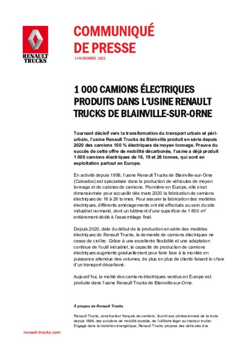 Tournant décisif vers la transformation du transport urbain et périurbain, l’usine Renault Trucks de Blainville produit en série depuis 2020 des camions 100 % électriques de moyen tonnage. Preuve du succès de cette offre de mobilité décarbonée, l’usine a déjà produit 1 000 camions électriques de 16, 19 et 26 tonnes, qui sont en exploitation partout en Europe.