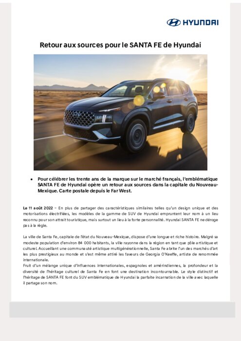 Constructeurs 16 août 2022 - 09:15 Pour célébrer les trente ans de la marque sur le marché français, l’emblématique SANTA FE de Hyundai opère un retour aux sources dans la capitale du Nouveau Mexique. Carte postale depuis le Far West. PDF (228 Ko) Télécharger
