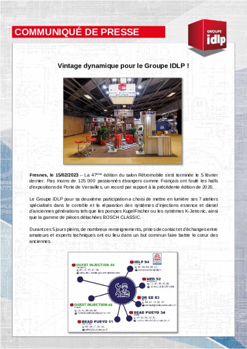 La 47ème édition du salon Rétromobile s’est terminée le 5 février dernier. Le Groupe IDLP pour sa deuxième participation a choisi de mettre en lumière ses 7 ateliers spécialisés dans le contrôle et la réparation des systèmes d’injections essence et diesel d’anciennes générations tels que les pompes KugelFischer ou les systèmes K-Jetronic, ainsi que la gamme de pièces détachées BOSCH CLASSIC.