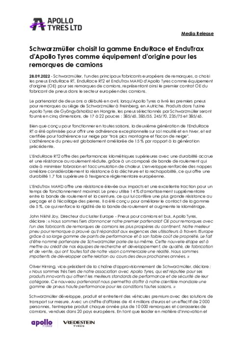 Schwarzmüller, l'un des principaux fabricants européens de remorques, a choisi les pneus EnduRace RT, EnduRace RT2 et EnduTrax MAHD d'Apollo Tyres comme équipement d'origine (OE) pour ses remorques de camions, représentant ainsi le premier contrat OE du fabricant de pneus dans le secteur européen des camions.