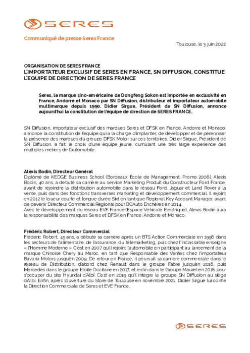 Seres, la marque sino-américaine de Dongfeng Sokon est importée en exclusivité en France, Andorre et Monaco par SN Diffusion, distributeur et importateur automobile multimarque depuis 1990. Didier Sirgue, Président de SN Diffusion, annonce aujourd’hui la constitution de l’équipe de direction de SERES FRANCE.