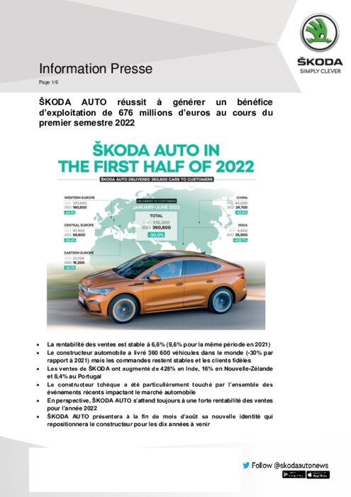 ŠKODA AUTO a livré 360 600 véhicules dans le monde au premier semestre 2022, soit 30% de moins que pour la même période en 2021. Ce résultat est la conséquence de la guerre en Ukraine et la pénurie persistante de semi-conducteurs. Le bénéfice d'exploitation de 676 millions d'euros est inférieur de 30,6% à celui de l'année précédente, tandis que le rendement des ventes résiste bien à 6,6% (9,6% l’année précédente).