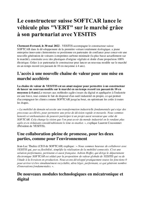 YESITIS accompagne le constructeur suisse SOFTCAR dans le développement de la première voiture totalement écologique. La jeune entreprise innovante clermontoise se positionne en partenaire de confiance pour concevoir une nouvelle génération de voitures à empreinte carbone minimale (la plus basse actuellement sur le marché), construite avec des plastiques d'origine végétale et dotée d'une propulsion 100% électrique.