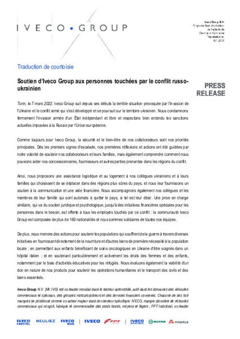 Iveco Group suit depuis ses débuts la terrible situation provoquée par l'invasion de l'Ukraine et le conflit armé qui s'est développé et se poursuit sur le territoire ukrainien. Nous condamnons fermement l'invasion armée d'un État indépendant et libre et respectons bien entendu les sanctions actuelles imposées à la Russie par l'Union européenne.
