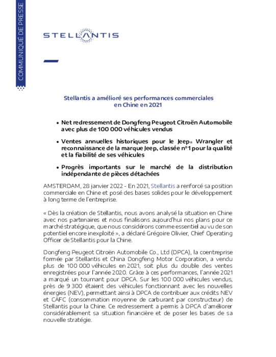 La coentreprise de Stellantis avec Dongfeng Peugeot Citroën Automobile (DCPA) a vu ses ventes bondir en 2021, avec "plus de 100.000 véhicules" vendus, "soit plus du double des ventes enregistrées" l'année précédente, explique le groupe dans un communiqué.