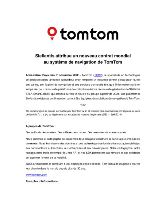 TomTom (TOM2), le spécialiste en technologies de géolocalisation, annonce aujourd'hui avoir remporté un nouveau contrat global pour fournir ses cartes, son logiciel de navigation et ses services connectés tels que l’information trafic en temps réel pour la nouvelle plateforme de cockpit numérique de nouvelle génération de Stellantis STLA SmartCockpit, qui arrivera sur les véhicules du groupe à partir de 2024.