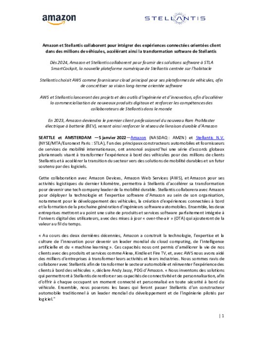 Stellantis va concevoir avec Amazon les logiciels de son "Smart cockpit", une plateforme électronique qui sera intégrée aux véhicules des 14 marques du groupe à partir de 2024, ont précisé les deux groupes dans un communiqué en marge du CES, la grand-messe de l'électronique de Las Vegas.