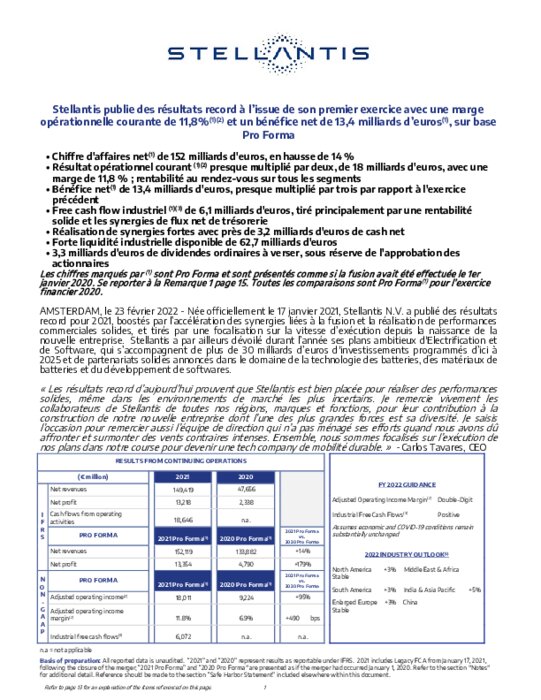 Avec 6,14 millions de voitures vendues en 2021, le constructeur a été privé de 1,6 million de véhicules par la pénurie de puces électroniques. Mais il a enregistré un chiffre d'affaires de 152 milliards d'euros, en hausse de 14% par rapport aux données cumulées des deux groupes en 2020.