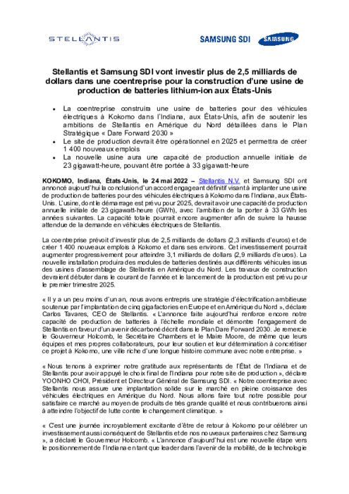 "La capacité totale pourrait encore augmenter afin de suivre la hausse attendue de la demande en véhicules électriques de Stellantis", a souligné le groupe issu de la fusion de Peugeot-Citroën et Fiat-Chrysler.
