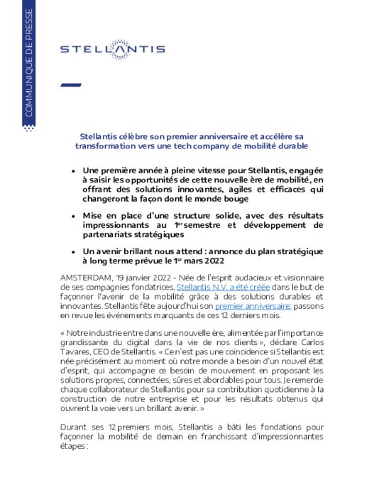 Née de l’esprit audacieux et visionnaire de ses compagnies fondatrices, Stellantis N.V. a été créée dans le but de façonner l'avenir de la mobilité grâce à des solutions durables et innovantes. Stellantis fête son premier anniversaire: passons en revue les événements marquants de ces 12 derniers mois.