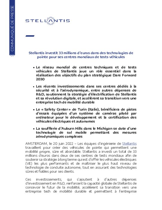 Les équipes d’ingénierie de Stellantis  travaillent pour créer des véhicules de pointe qui permettent une mobilité propre, sûre et abordable. Stellantis a investi un total de 33 millions d’euros dans deux de ses centres de tests mondiaux afin de soutenir sa stratégie à long terme qui est d’offrir les véhicules électriques (VE) les plus performants et de maîtriser le plus haut niveau de technologie de conduite autonome, tout en assurant des technologies sûres et fiables pour ses clients.