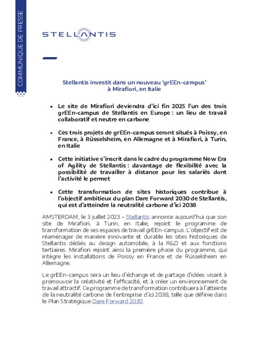 Le site de Mirafiori deviendra d’ici fin 2025 l’un des trois grEEn-campus de Stellantis en Europe : un lieu de travail collaboratif et neutre en carbone. Ces trois projets de grEEn-campus seront situés à Poissy, en France, à Rüsselsheim, en Allemagne et à Mirafiori, à Turin, en Italie