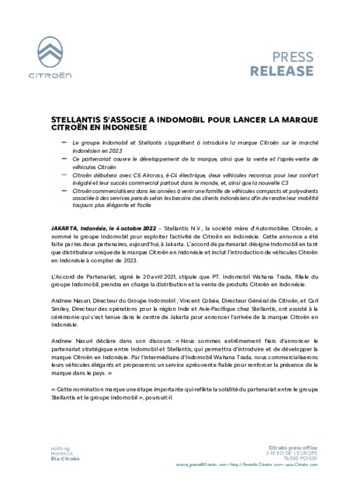 Stellantis N.V., la société mère d’Automobiles Citroën, a nommé le groupe Indomobil pour exploiter l’activité de Citroën en Indonésie. Cette annonce a été faite par les deux partenaires, aujourd’hui, à Jakarta. L’accord de partenariat désigne Indomobil en tant que distributeur unique de la marque Citroën en Indonésie et inclut l’introduction de véhicules Citroën en Indonésie à compter de 2023.