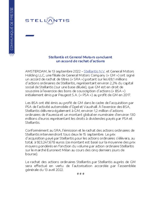 Par ailleurs, dans le cadre de cette opération, Stellantis "délivrera également à GM environ 1,2 million d'actions ordinaires de Faurecia et un montant global en numéraire d'environ 130 millions d'euros représentant les droits à dividendes payés par PSA et Stellantis", poursuit le communiqué.