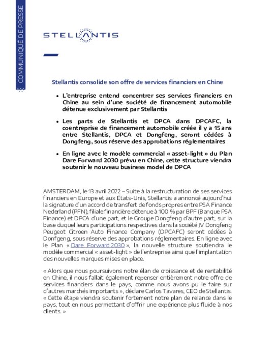 Concernant la coentreprise de financement automobile existante entre le constructeur automobile chinois Dongfeng, Stellantis et DPCA - coentreprise de PSA et Dongfeng Motors -, "les parts de Stellantis et DPCA seront cédées à Dongfeng", est-il précisé.