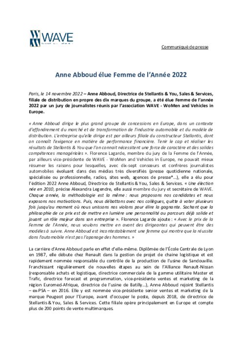 Anne Abboud, Directrice de Stellantis & You, Sales & Services, filiale de distribution en propre des dix marques du groupe, a été élue Femme de l’année 2022 par un jury de journalistes réunis par l’association WAVE - WoMen and Vehicles in Europe.