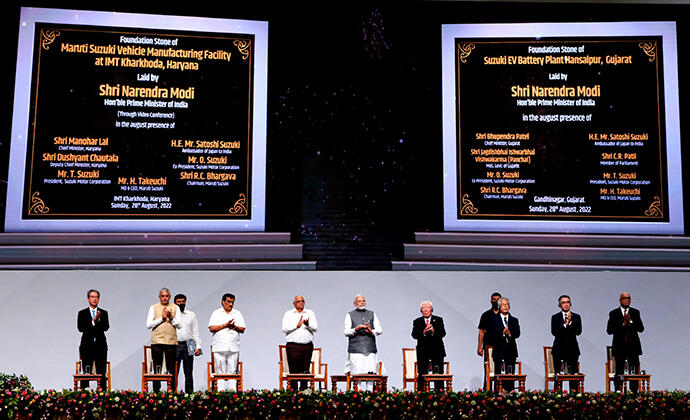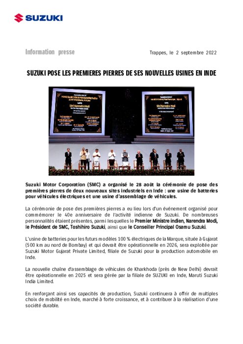 Suzuki Motor Corporation (SMC) a organisé le 28 août la cérémonie de pose des premières pierres de deux nouveaux sites industriels en Inde : une usine de batteries pour véhicules électriques et une usine d’assemblage de véhicules.