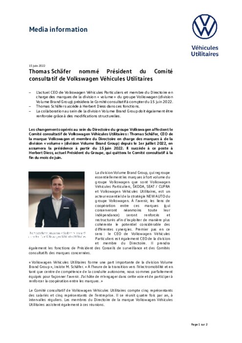 Les changements opérés au sein du Directoire du groupe Volkswagen affectent le Comité consultatif de Volkswagen Véhicules Utilitaires : Thomas Schäfer, CEO de la marque Volkswagen et membre du Directoire en charge des marques à de la division « volume » (division Volume Brand Group) depuis le 1er juillet 2022, en assumera la présidence à partir du 15 juin 2022. Il succède à ce poste à Herbert Diess, actuel Président du Groupe, qui quittera le Comité consultatif à la fin du mois de juin.