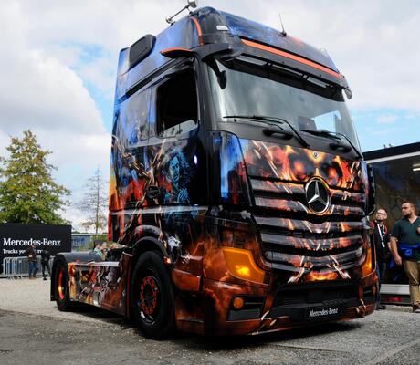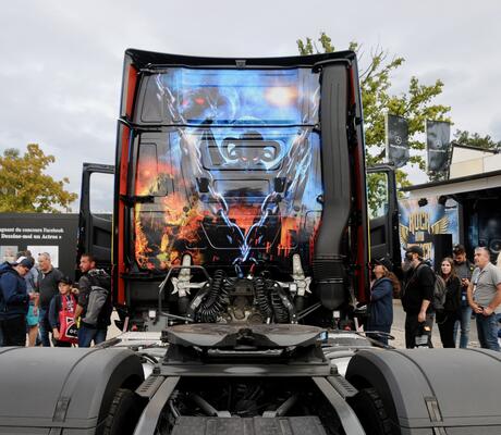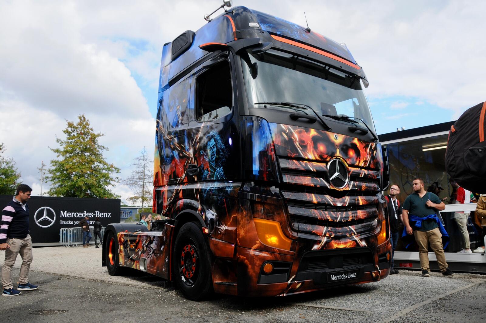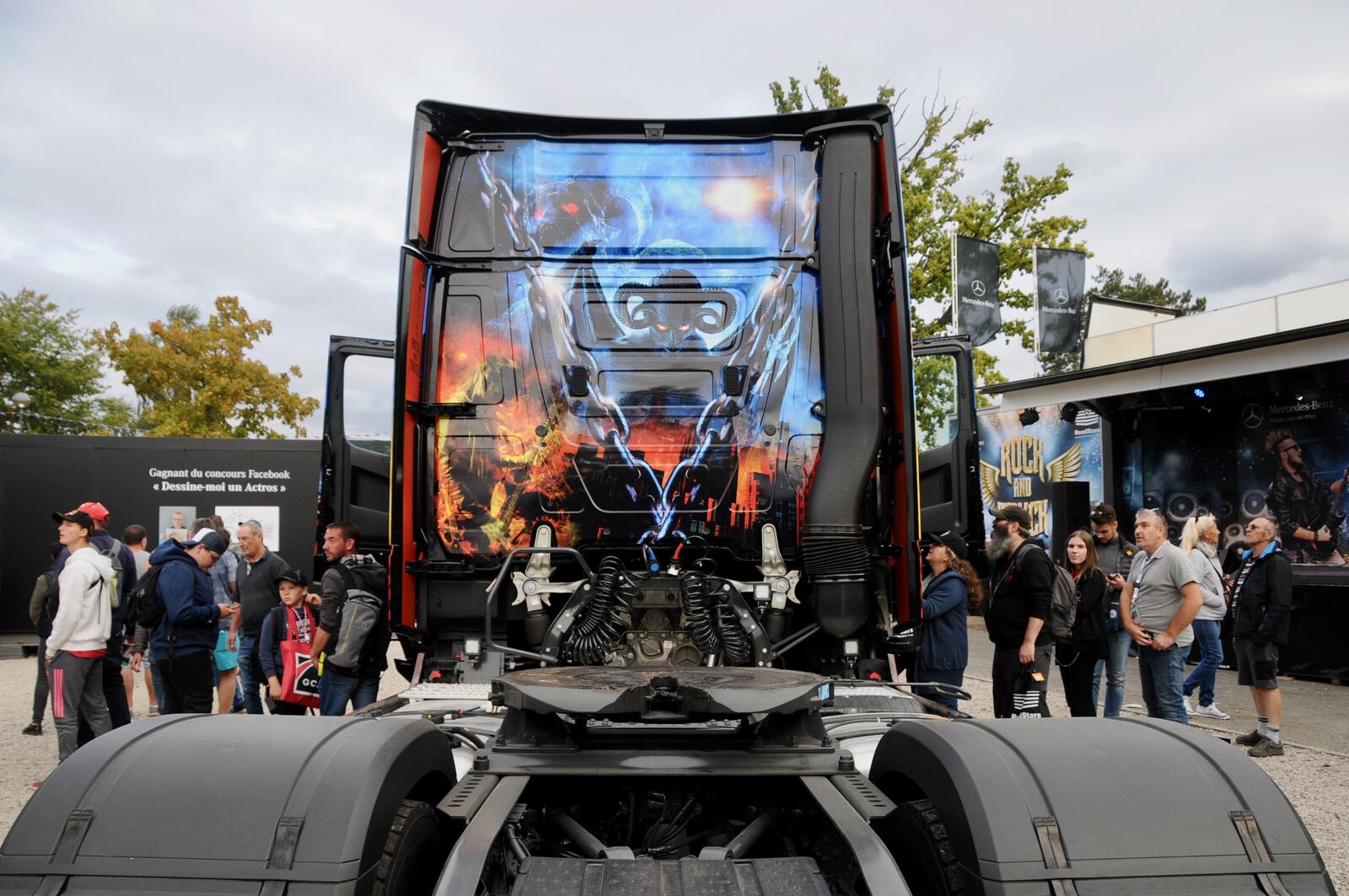 C’est dans les studios de la société Facing à Fretin non loin de Lille que la robe de cet Actros a été imaginée. Le « pitch » était simple : coller au mieux avec le thème choisi par Mercedes-Benz Trucks France pour sa participation à la 37è édition des 24 Heures du Mans Camions qui se sont déroulés il y a quelques jours sur le mythique circuit sarthois, à savoir « Rock & Truck ». Et le moins que l’on puisse dire, c’est que l’ensemble est fort réussi !