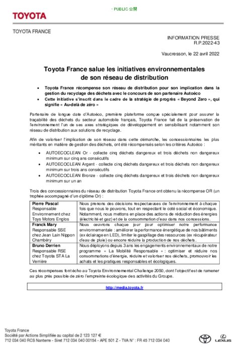 Partenaire de longue date d’Autoéco, première plateforme conçue spécialement pour assurer la traçabilité des déchets du secteur automobile français, Toyota France fait de la préservation de l’environnement l’un de ses axes stratégiques de développement en sensibilisant notamment son réseau de distribution aux solutions de recyclage.