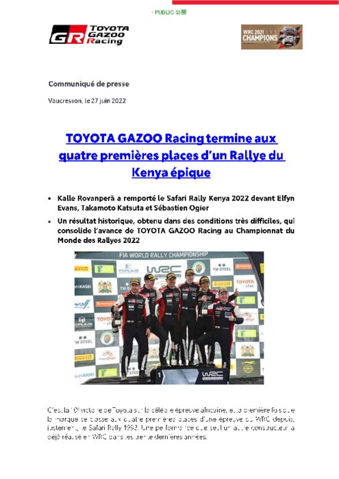 Kalle Rovanperä a remporté le Safari Rally Kenya 2022 devant Elfyn Evans, Takamoto Katsuta et Sébastien Ogier. Un résultat historique, obtenu dans des conditions très difficiles, qui consolide l’avance de TOYOTA GAZOO Racing au Championnat du Monde des Rallyes 2022.