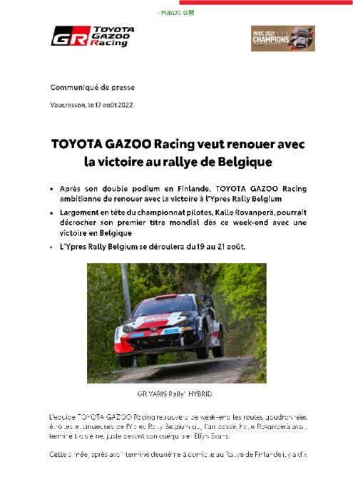 Après son double podium en Finlande, TOYOTA GAZOO Racing ambitionne de renouer avec la victoire à l’Ypres Rally Belgium. Largement en tête du championnat pilotes, Kalle Rovanperä, pourrait décrocher son premier titre mondial dès ce week-end avec une victoire en Belgique. L’Ypres Rally Belgium se déroulera du 19 au 21 août.