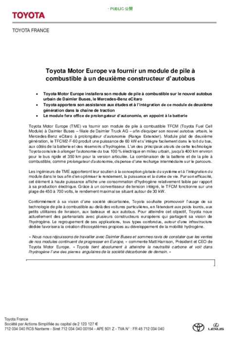 Toyota Motor Europe (TME) va fournir son module de pile à combustible TFCM (Toyota Fuel Cell Module) à Daimler Buses – filiale de Daimler Truck AG – afin d’équiper son nouvel autobus urbain, le Mercedes Benz eCitaro à prolongateur d’autonomie (Range Extender). Module plat de deuxième génération, le TFCM2-F-60 produit une puissance de 60 kW et s’intègre facilement dans le toit du bus, aux côtés de la batterie et des réservoirs d’hydrogène.