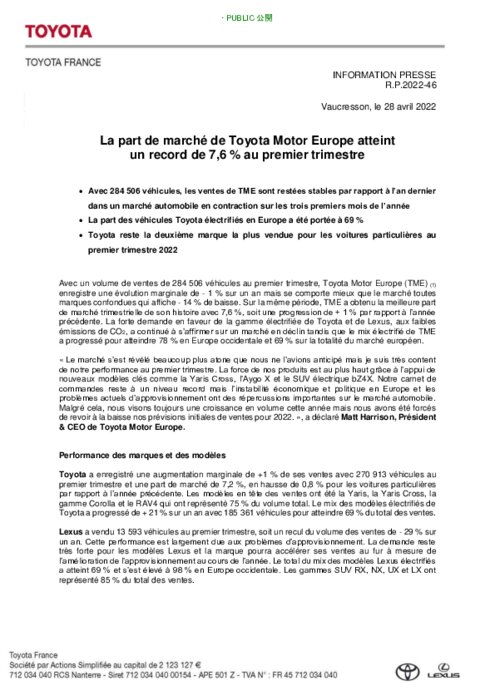 Avec 284 506 véhicules, les ventes de TME sont restées stables par rapport à l’an dernier dans un marché automobile en contraction sur les trois premiers mois de l’année. La part des véhicules Toyota électrifiés en Europe a été portée à 69 %. Toyota reste la deuxième marque la plus vendue pour les voitures particulières au premier trimestre 2022.