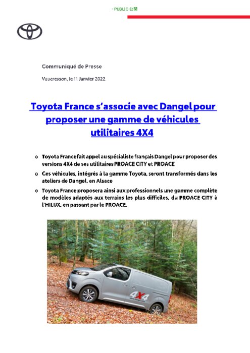 Toyota France annonce son partenariat avec Dangel, une entreprise française forte d’une expertise de plus de 40 ans dans les transmissions 4X4. Cette association va permettre à Toyota France de commercialiser des versions à quatre roues motrices de ses utilitaires PROACE CITY et PROACE. Disponibles à la commande chez tous les concessionnaires Toyota, ces véhicules utilitaires seront équipés de leur transmission 4X4 dans les ateliers Dangel de Sentheim, en Alsace...