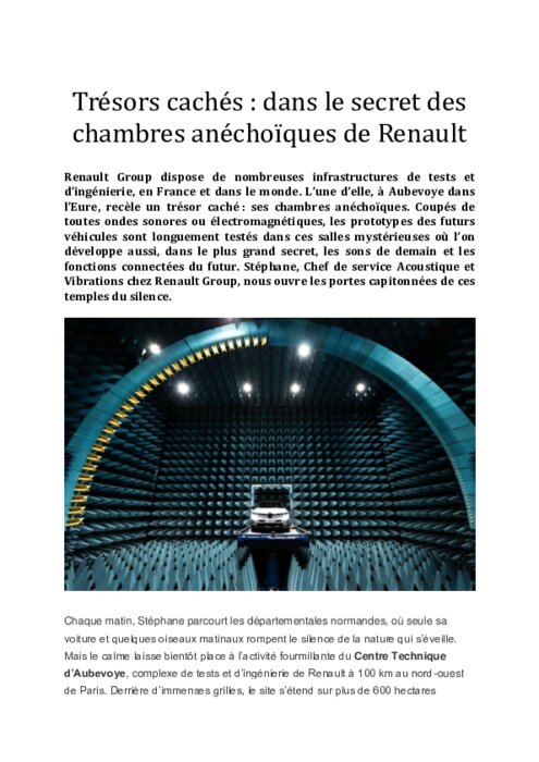 Renault Group dispose de nombreuses infrastructures de tests et d’ingénierie, en France et dans le monde. L’une d’elle, à Aubevoye dans l’Eure, recèle un trésor caché : ses chambres anéchoïques. Coupés de toutes ondes sonores ou électromagnétiques, les prototypes des futurs véhicules sont longuement testés dans ces salles mystérieuses où l’on développe aussi, dans le plus grand secret, les sons de demain et les fonctions connectées du futur.