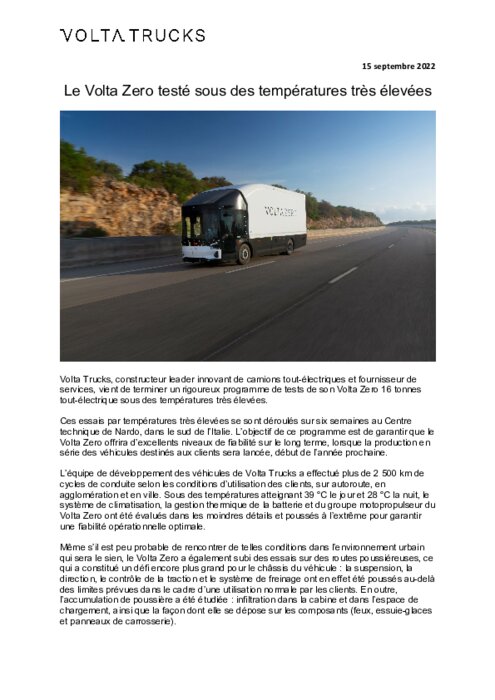 Volta Trucks, constructeur leader innovant de camions tout-électriques et fournisseur de services, vient de terminer un rigoureux programme de tests de son Volta Zero 16 tonnes tout-électrique sous des températures très élevées.