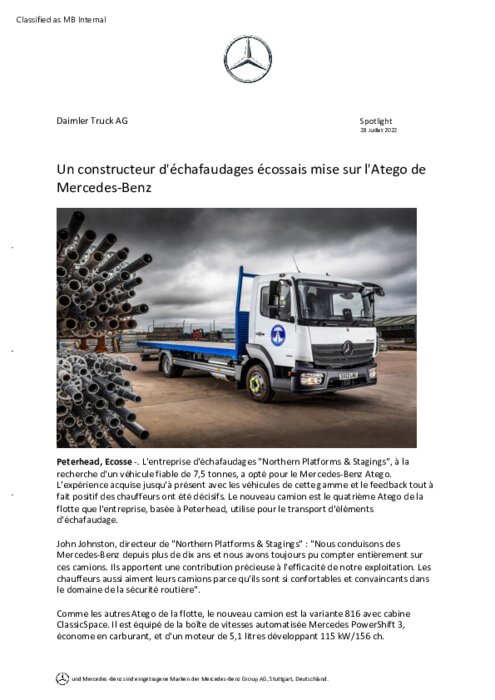 L'entreprise d'échafaudages "Northern Platforms & Stagings", à la recherche d'un véhicule fiable de 7,5 tonnes, a opté pour le Mercedes-Benz Atego. L'expérience acquise jusqu'à présent avec les véhicules de cette gamme et le feedback tout à fait positif des chauffeurs ont été décisifs. Le nouveau camion est le quatrième Atego de la flotte que l'entreprise, basée à Peterhead, utilise pour le transport d'éléments