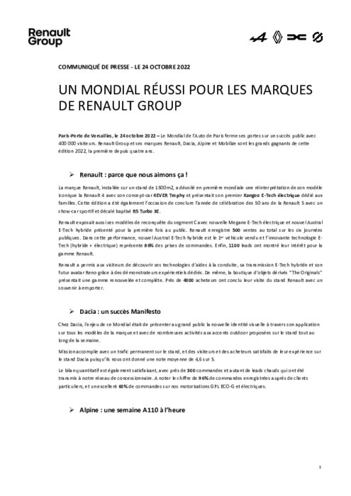 Constructeurs 25 octobre 2022 - 09:00 Le Mondial de l’Auto de Paris ferme ses portes sur un succès public avec 400 000 visiteurs. Renault Group et ses marques Renault, Dacia, Alpine et Mobilize sont les grands gagnants de cette édition 2022, la première depuis quatre ans. PDF (167 Ko) Télécharger