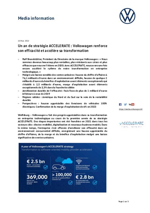 Volkswagen a fait des progrès appréciables dans sa transformation en entreprise technologique au cours de la première année de sa stratégie ACCELERATE. Des étapes importantes ont été franchies en 2021 dans tous les secteurs clés: électro-mobilité, digitalisation et nouveaux business models. Dans le même temps, l’entreprise s’est efforcée d’améliorer son efficacité dans un environnement concurrentiel difficile, enregistrant une hausse appréciable du chiffre d’affaires, de la marge et du bénéfice.