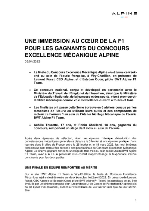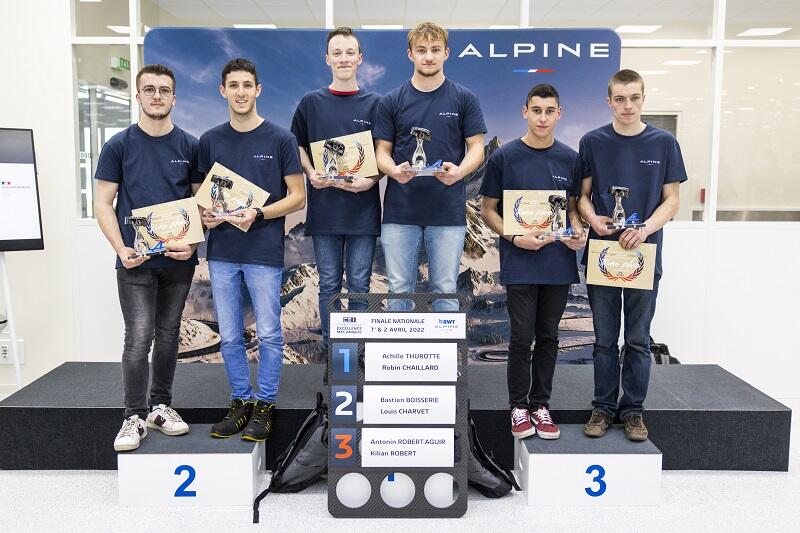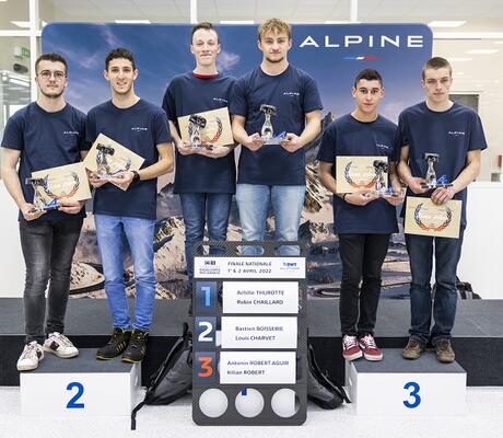 Le binôme lauréat, Achille Thurotte, 17 ans, et Robin Chaillard, 18 ans, remporte un stage de 3 mois qui sera l’occasion de travailler sur le moteur de la saison 2022 de Formule 1, au sein de l’atelier montage mécanique BWT Alpine F1 Team à Viry-Châtillon. Permettant au binôme de développer ses compétences, de découvrir l’importance du savoir être et de faire preuve de sa motivation, ce stage pourra éventuellement se conclure par un contrat d’apprentissage...