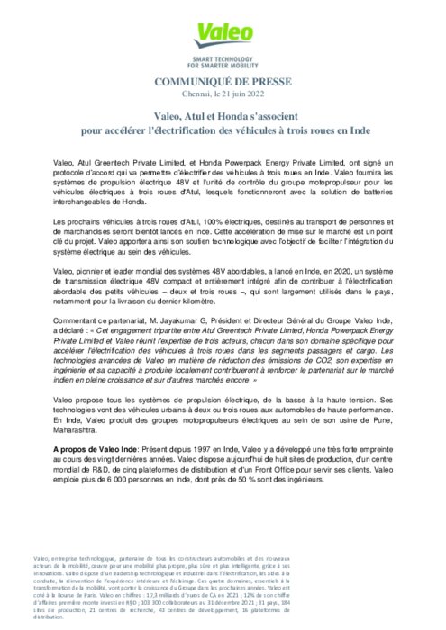 Valeo, Atul Greentech Private Limited, et Honda Powerpack Energy Private Limited, ont signé un protocole d’accord qui va permettre d’électrifier des véhicules à trois roues en Inde. Valeo fournira les systèmes de propulsion électrique 48V et l'unité de contrôle du groupe motopropulseur pour les véhicules électriques à trois roues d'Atul, lesquels fonctionneront avec la solution de batteries interchangeables de Honda.