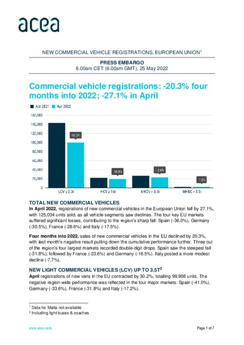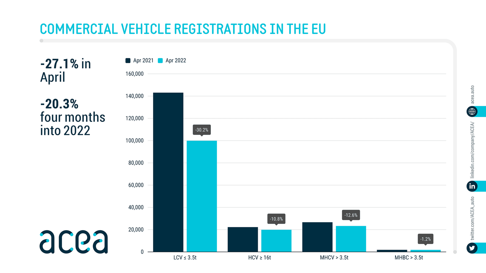 En avril 2022, les immatriculations de véhicules utilitaires neufs dans l'Union européenne ont chuté de 27,1 %, avec 125 034 unités vendues, tous les segments de véhicules ayant connu des baisses. Les quatre principaux marchés de l'UE ont subi des pertes importantes, contribuant à la forte baisse de la région : l'Espagne (-36,0 %), l'Allemagne (-30,5 %), la France (-28,6 %) et l'Italie (-17,5 %).