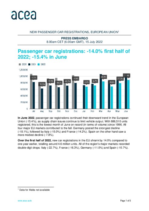 Les ventes d'automobiles ont chuté de 14% dans l'Union européenne au premier semestre 2022 comparé à la même période de 2021, a indiqué vendredi l'Association des constructeurs européens (ACEA).