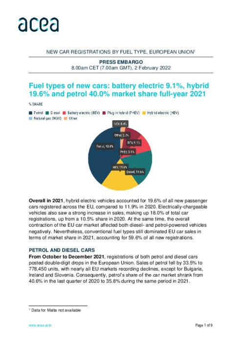 Sur l'ensemble de l'année 2021, les ventes d'hybrides non rechargeables (diesel ou essence) ont continué de croître (+60,5% sur un an) avec 1,9 million de voitures écoulées, soit 19,6% de parts de marché, à égalité avec le diesel simple.