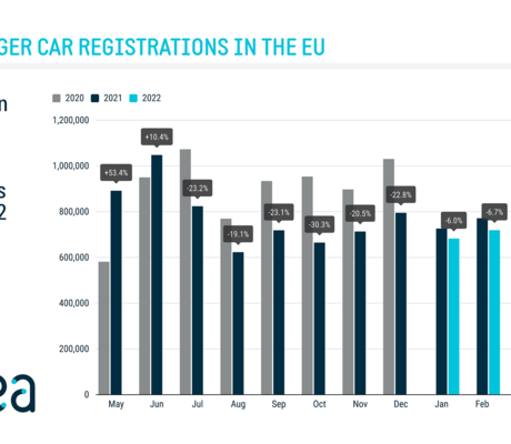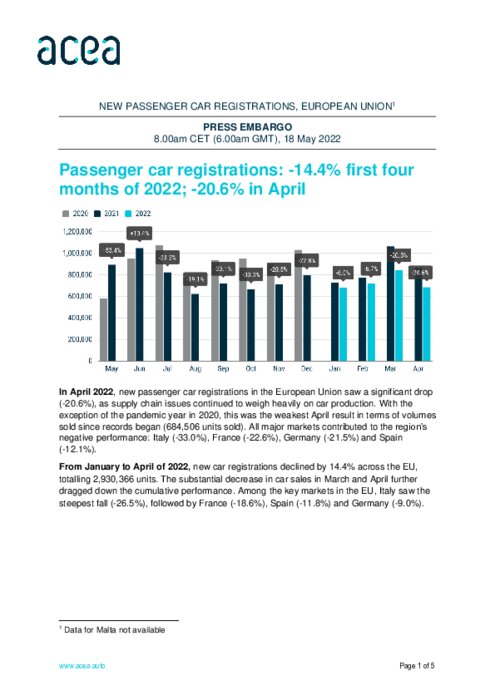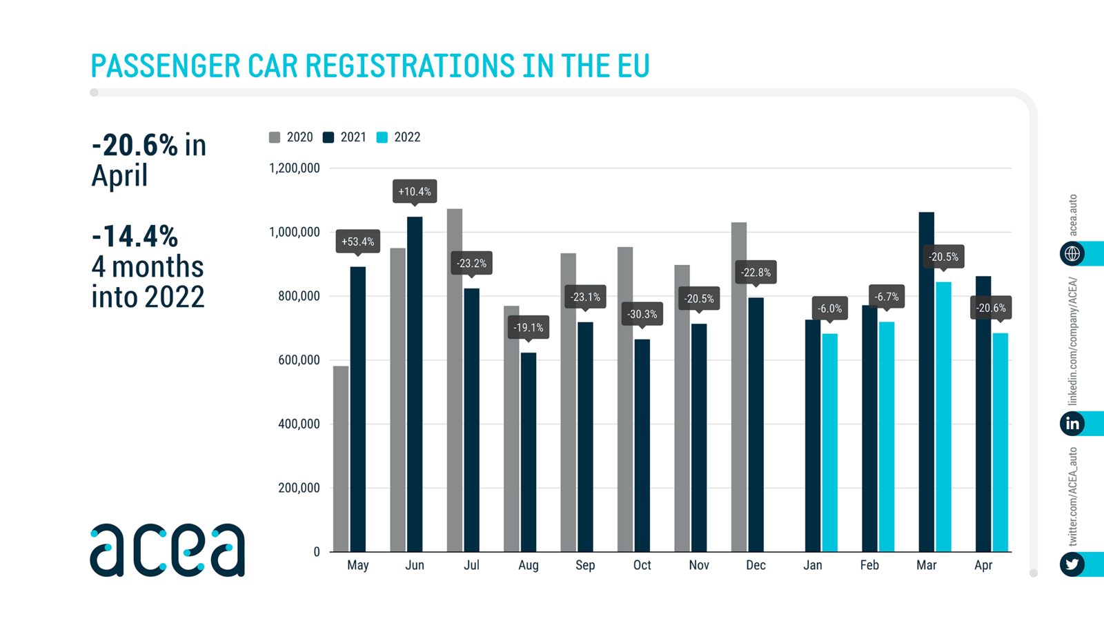 Avec 684.000 véhicules neufs vendus, en pleine pénurie de puces électroniques, c'est le plus faible mois d'avril enregistré par l'ACEA depuis le début de la série statistique en 1990, hors le cas exceptionnel de 2020, au début de la pandémie de Covid-19.