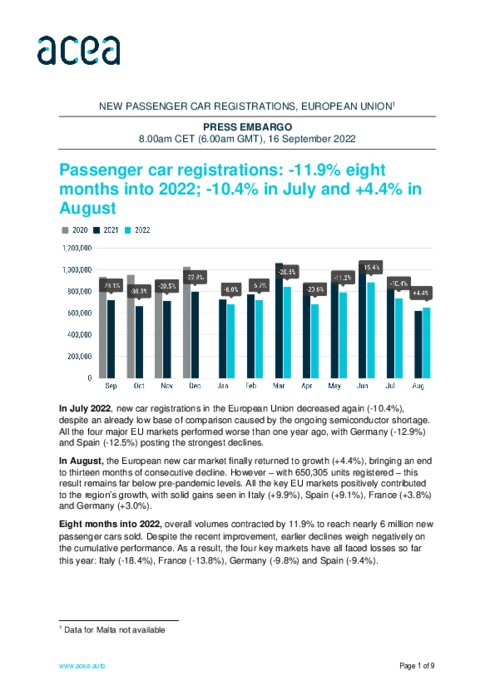 Cependant, avec 650.000 voitures écoulées au mois d'août, le marché européen reste "bien en dessous de son niveau d'avant la pandémie", avec de fortes ventes enregistrées en 2018 et 2019, a souligné l'ACEA dans un communiqué.