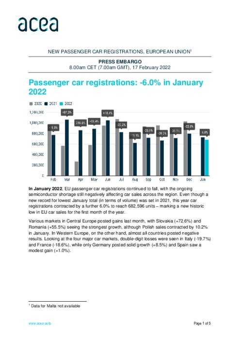 Seule l'Allemagne a rebondi de 8,5% par rapport à un mois de janvier 2021 très faible, tandis que l'Espagne restait stable (+1%). Près de l'UE, le Royaume-Uni a également enregistré un impressionnant rebond de ses ventes (+27,5%) après des mois de chute.
